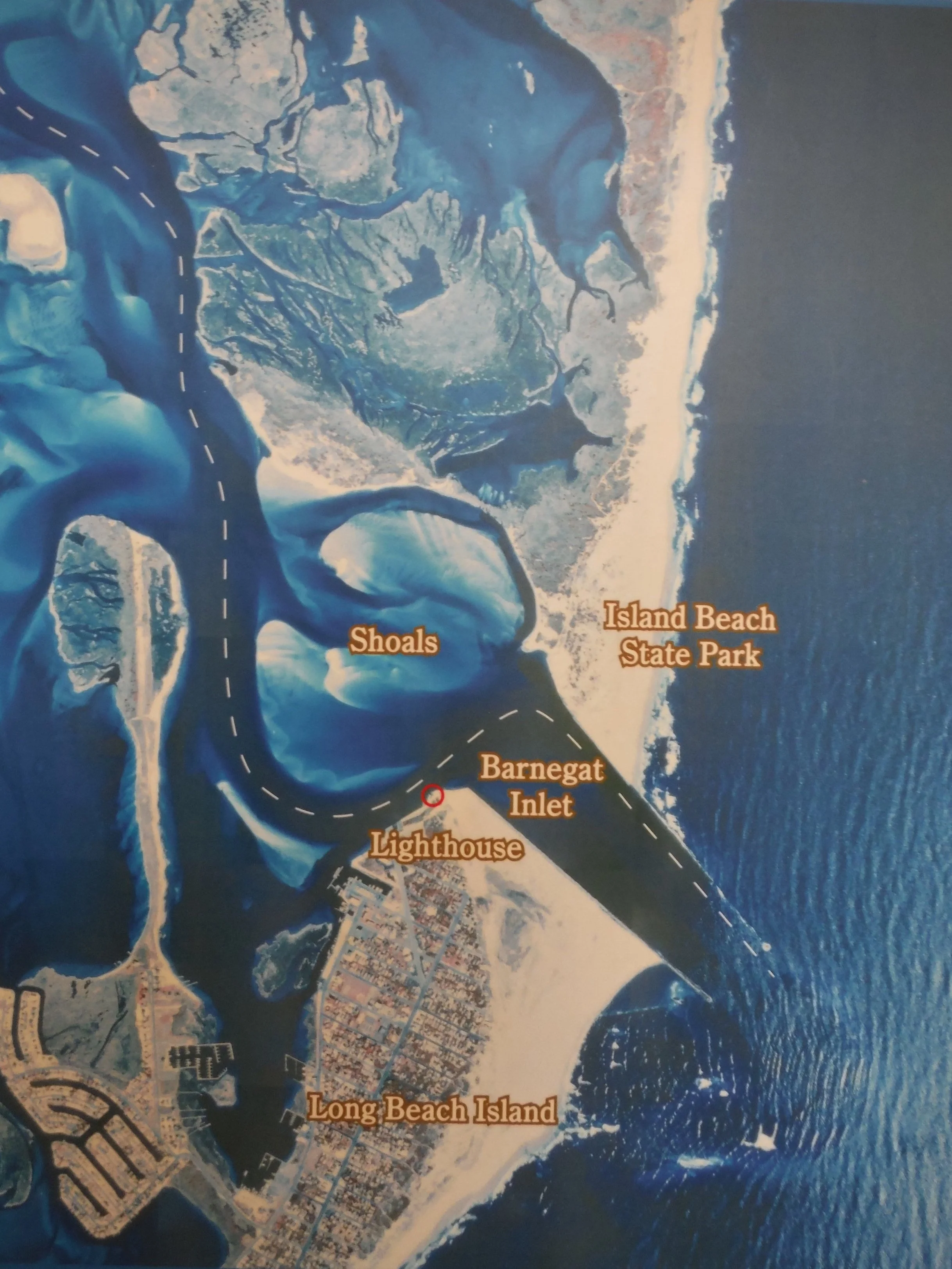 The modern-day opening of Barnegat Inlet. The changes are from repeated human development projects and dredging. Image from NJDEP.