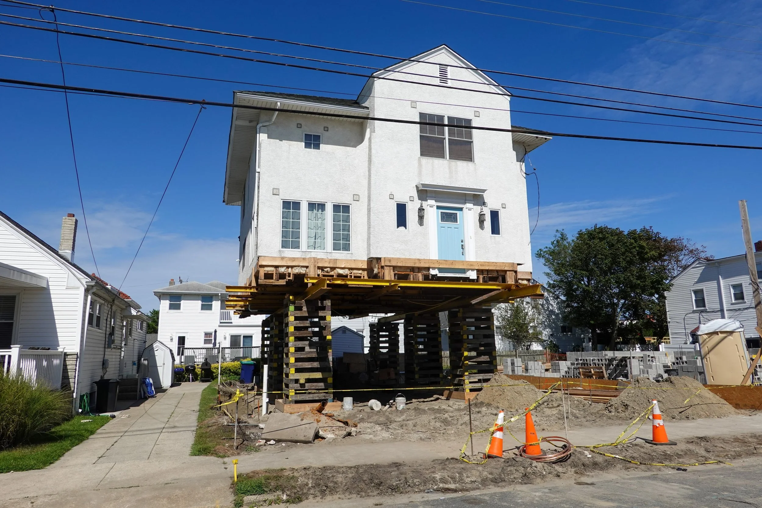House on supports as it is being raised to protect it from raising flood waters due to global warming .