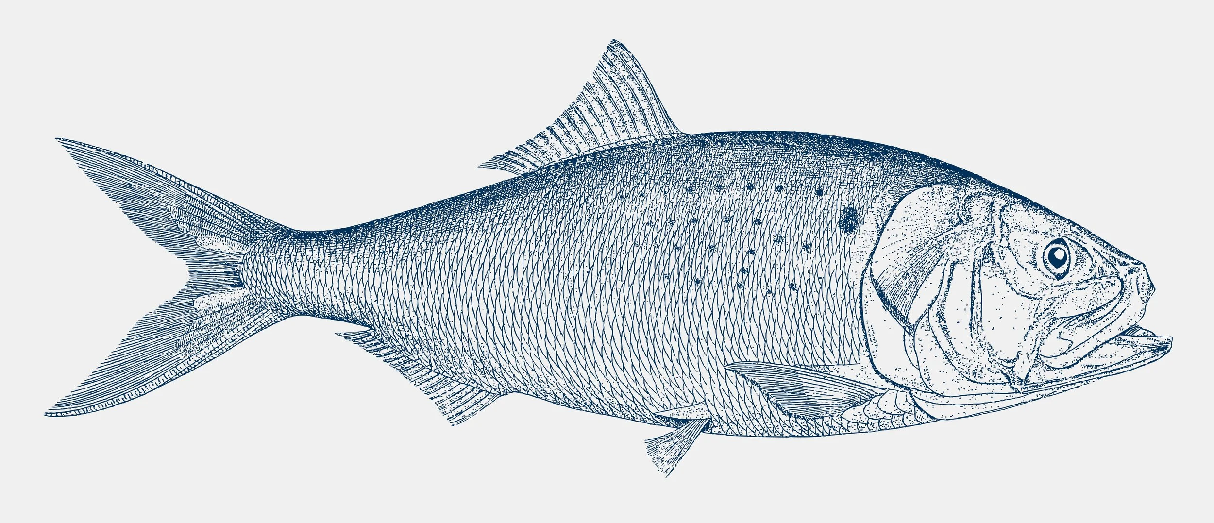 Atlantic menhaden are common fish in estuaries and coastal waters from Nova Scotia to northern Florida. Menhaden are small, flat-bodied, fish with deeply forked tails. They have bright silver scales, and are characterized by a series of smaller dark spots behind the main, black humeral spot.