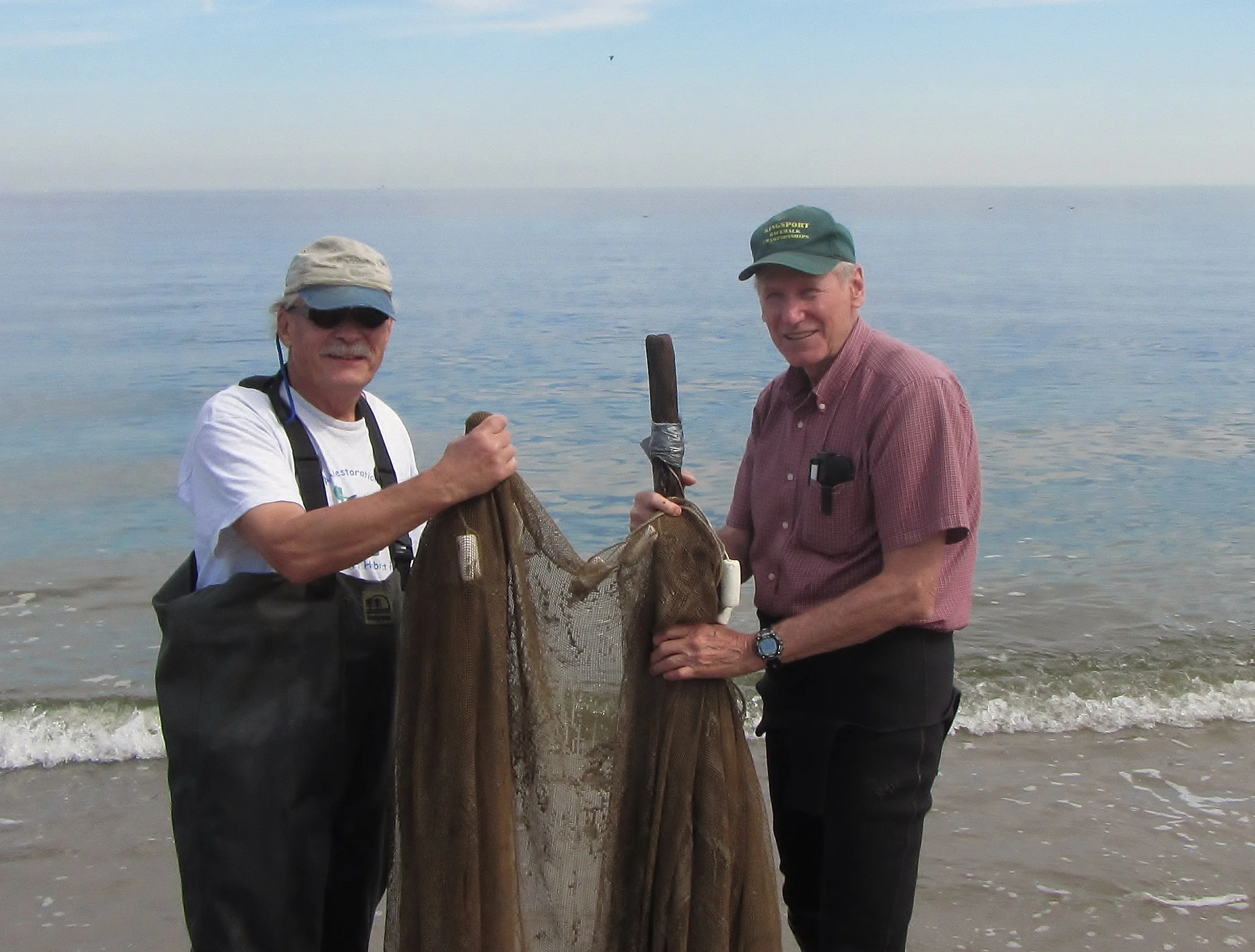 Frank Steimle (left) and Eugene W. Geer Jr (right) started a series of organized public seining events in 1971 along Raritan Bay and Sandy Hook Bay, NJ to help educate people about the fish, crabs, and other aquatic organisms living in local waters during the early 1970s.